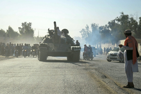 Pic: Fighters of the Afghanistan Ṭālebān Movement on a tank while heading towards the borders with Pakistan. 15 October 2025. (AFP)