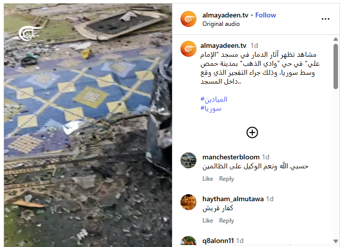 A security source told the official Syrian SANA news agency that the preliminary investigations suggest that the explosion in the Imām ‘Alī ibn Abī Ṭālib mosque – frequented by members of the ‘Alawī community – was the result of an explosive device that had been implanted inside.